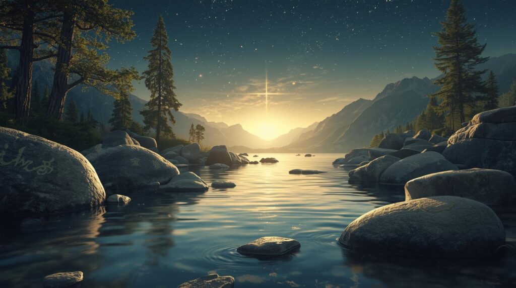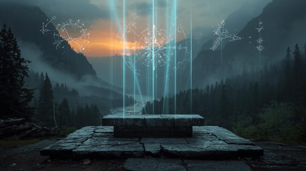 حجرات أثرية محفورة برموز غامضة، نجم ثماني النقاط يتوهج في المركز، يرمز لفهم الزمن والدورات الكونية.